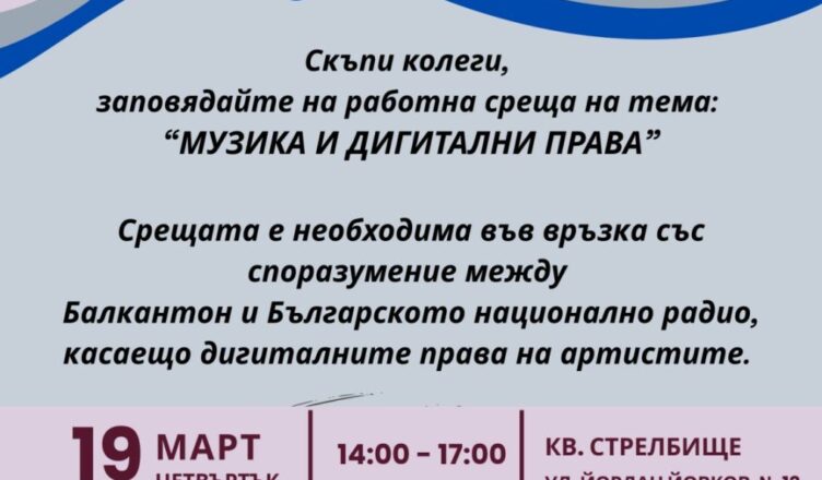 На 19 март в София ще се проведе важна работна среща на тема „Музика и дигитални права“, организирана от Сдружението на независимите артисти, музиканти и певци (СНАМП). Събитието ще събере представители на музикалната индустрия, независими артисти, продуценти и експерти, които ще обсъдят ключови въпроси, свързани с дигиталното разпространение на музика и защитата на правата на българските изпълнители.